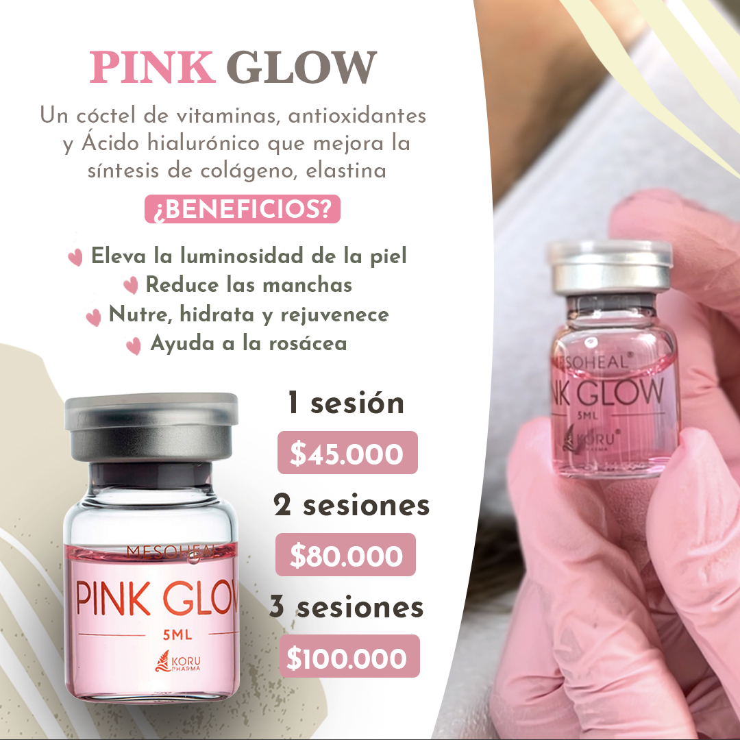 - Mesoheal Pink Glow es una combinación de 55 principios activos, ricos en compuestos bioactivos que favorecen la biología interna para la expresión de enzimas antioxidantes, también ayudan a disminuir procesos inflamatorios y oxidativos.